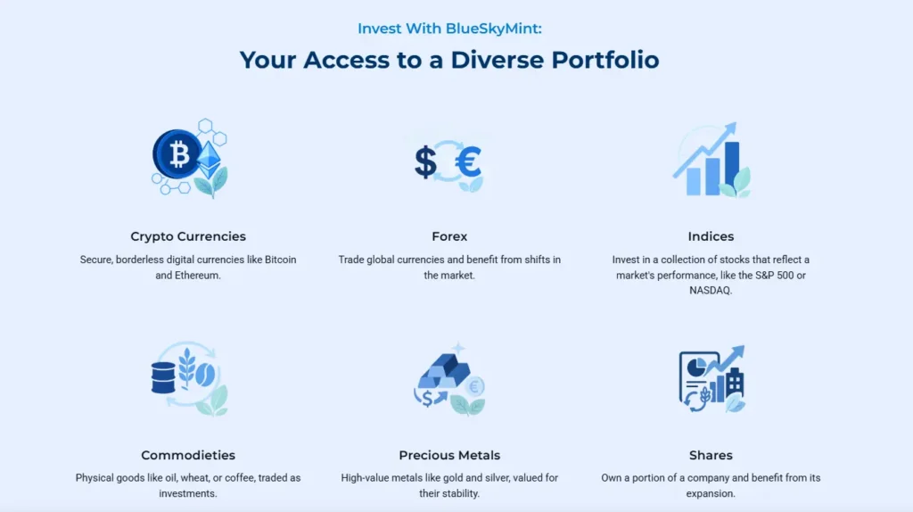 BlueSkyMint provides comprehensive market access spanning traditional and digital asset classes. The platform supports diverse trading opportunities across global markets.