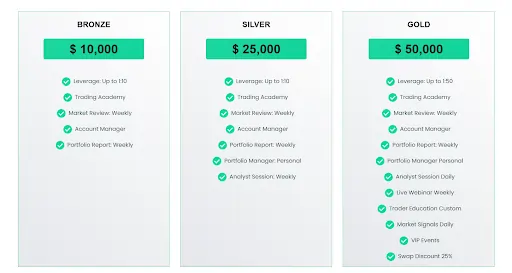 Bronze starts at $10,000 minimum deposit and provides trading academy access, weekly market reviews, an account manager, and weekly portfolio reports. The account manager is shared among multiple Bronze users rather than dedicated to individuals.