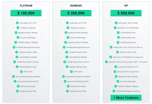 Platinum at $100,000 maintains all Gold features while adding monthly accountant sessions, 24/7 account monitoring, and annual summary reports. The accountant sessions help users understand tax implications and record-keeping requirements for trading activities.